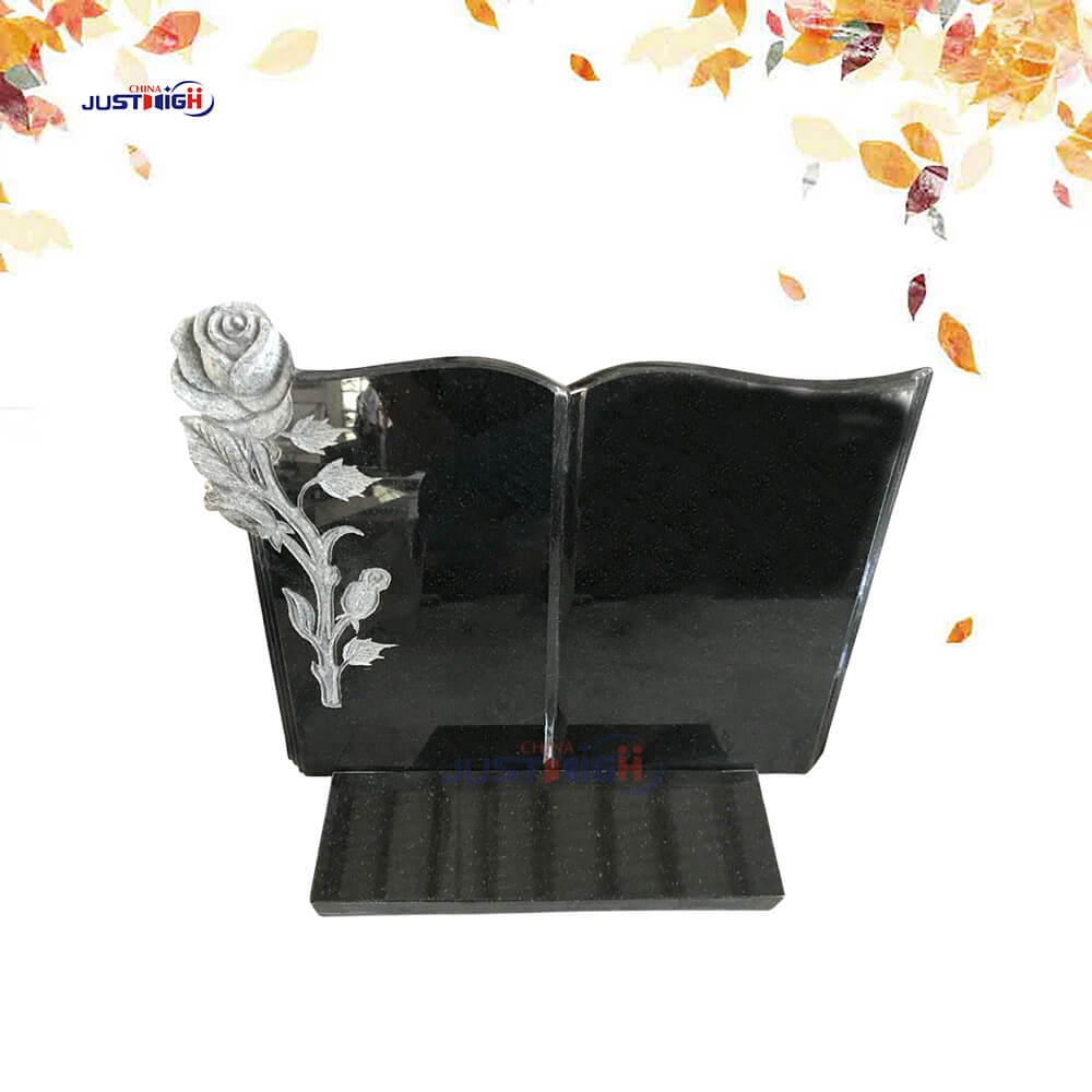 Plaque commémorative en granit en forme de livre avec fleurs sculptées